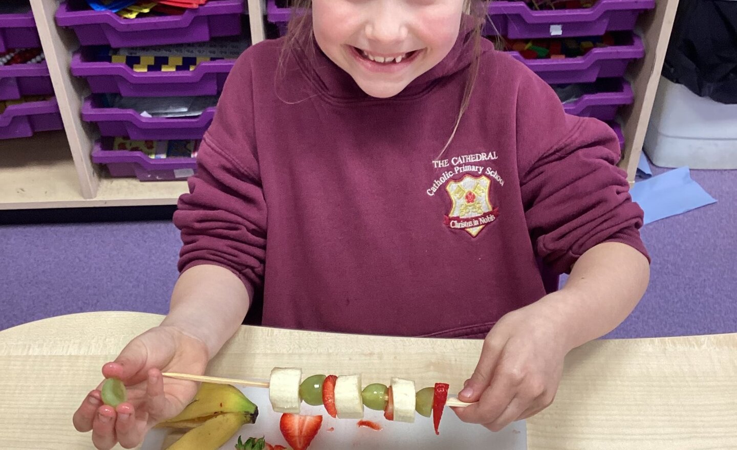 This afternoon, Year 1 have made fruit kebabs which they designed last week. They all enjoyed eating their kebabs.