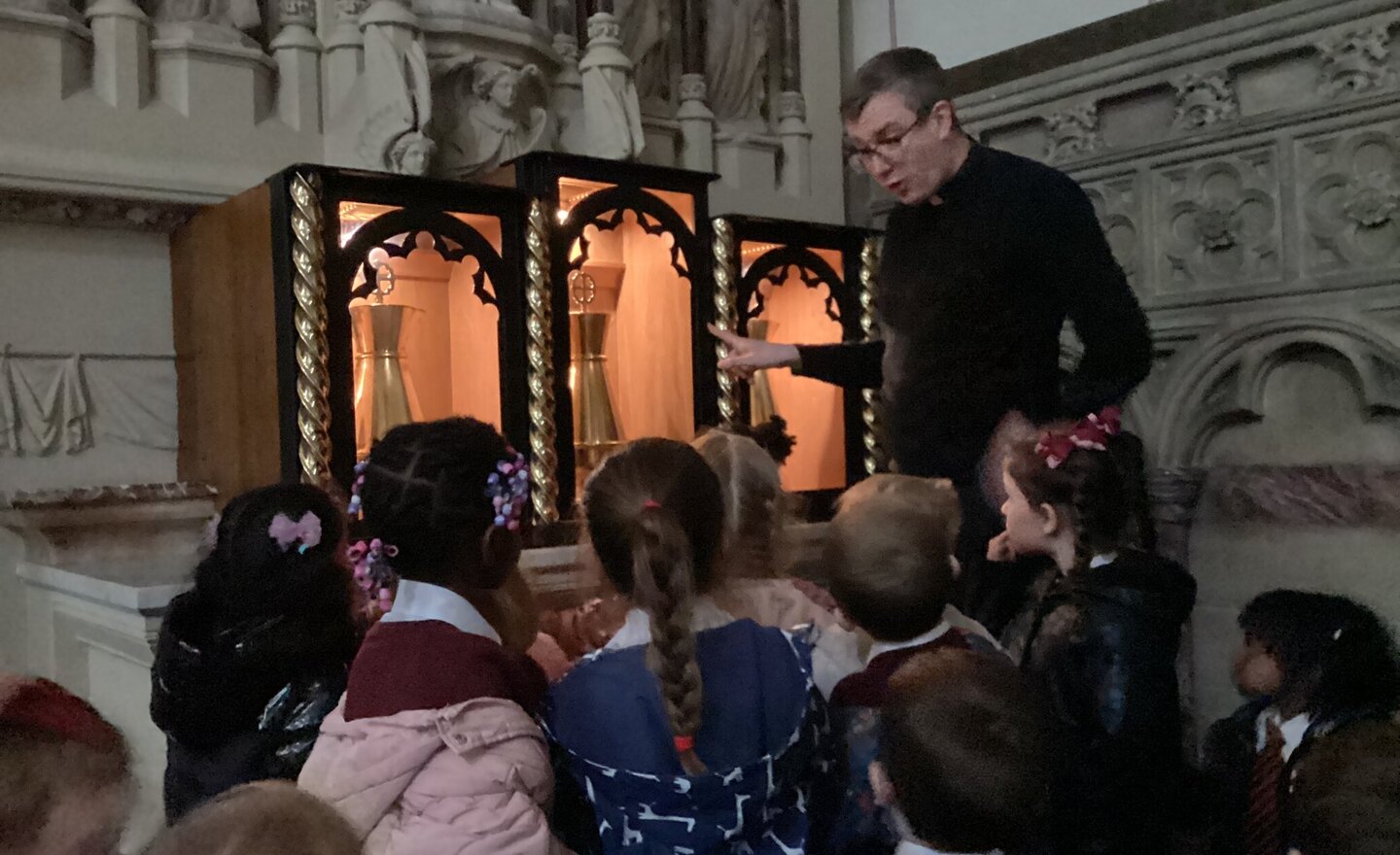 This week we have been learning about baptism in RE. We were really luck to go and visit the Cathedral and meet Fr John. He showed us the font and the shell he uses to baptise people. Fr John also showed us where they keep the special oil used to bless people when they are baptised.