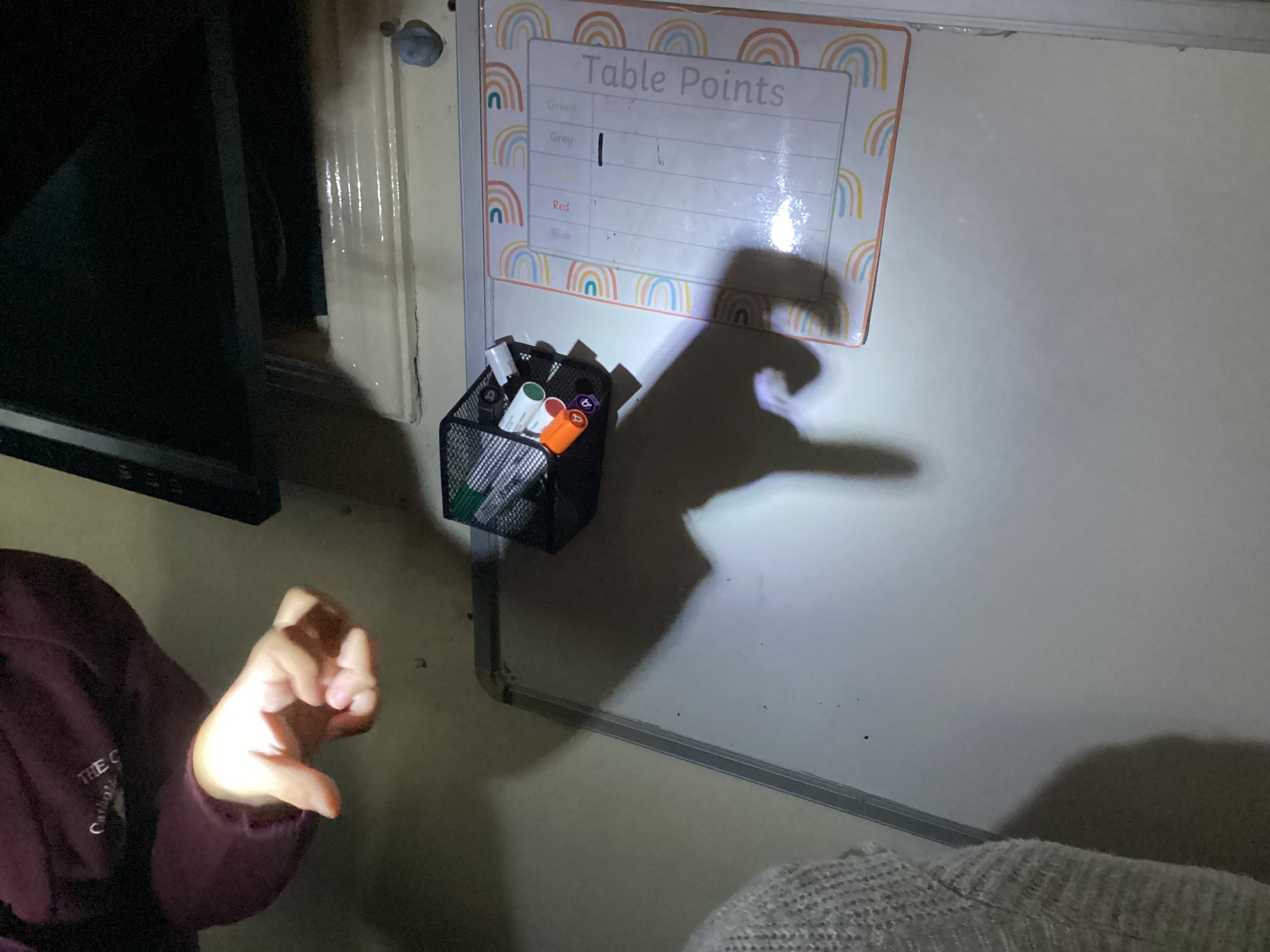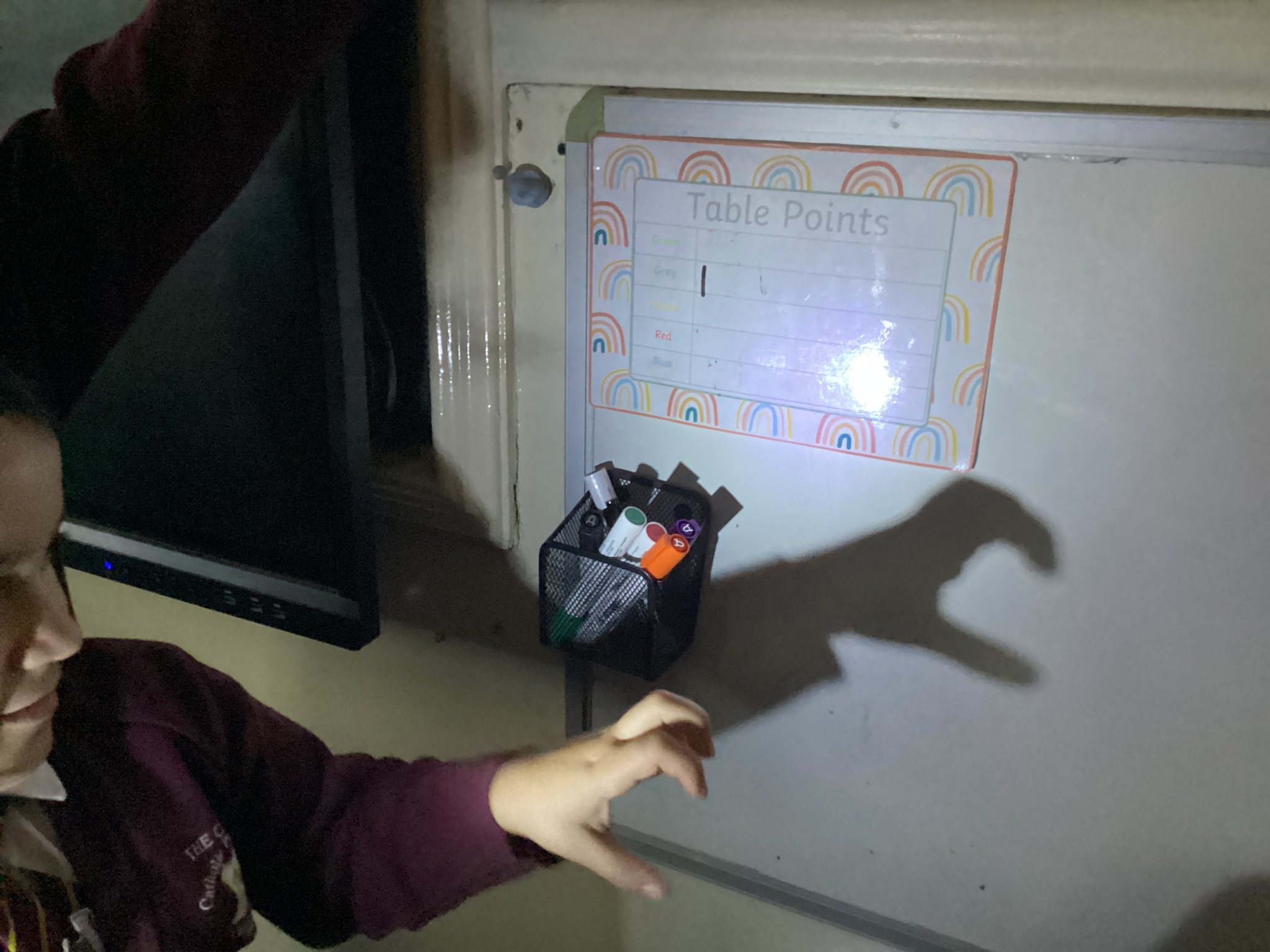 Yesterday, in our science lesson we had some fun in the dark using our torches to create shadows! We tired to make some different shadow animals and some of us even tried to tell stories.