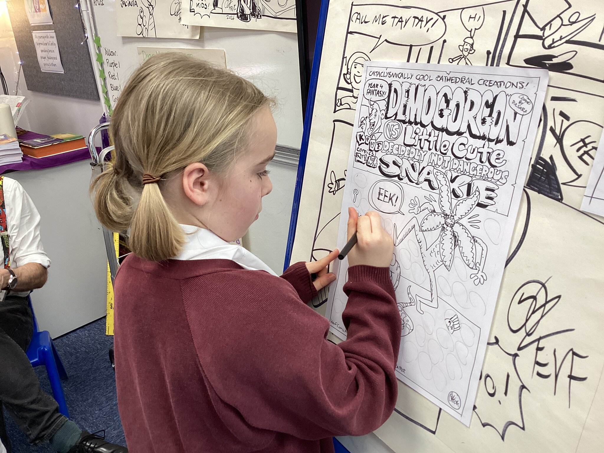 Today, Year 4 were delighted to welcome the comic artist, Kev F Sutherland who led a workshop on comic art. During the workshop, Kev modelled how to create comic characters and how to draw a comic strip. He worked with us to create our own class comic, including a comic portrait of every child in the class. The children's imagination and drawing skills were amazing as shown in the characters they created. Well done, Year 4!