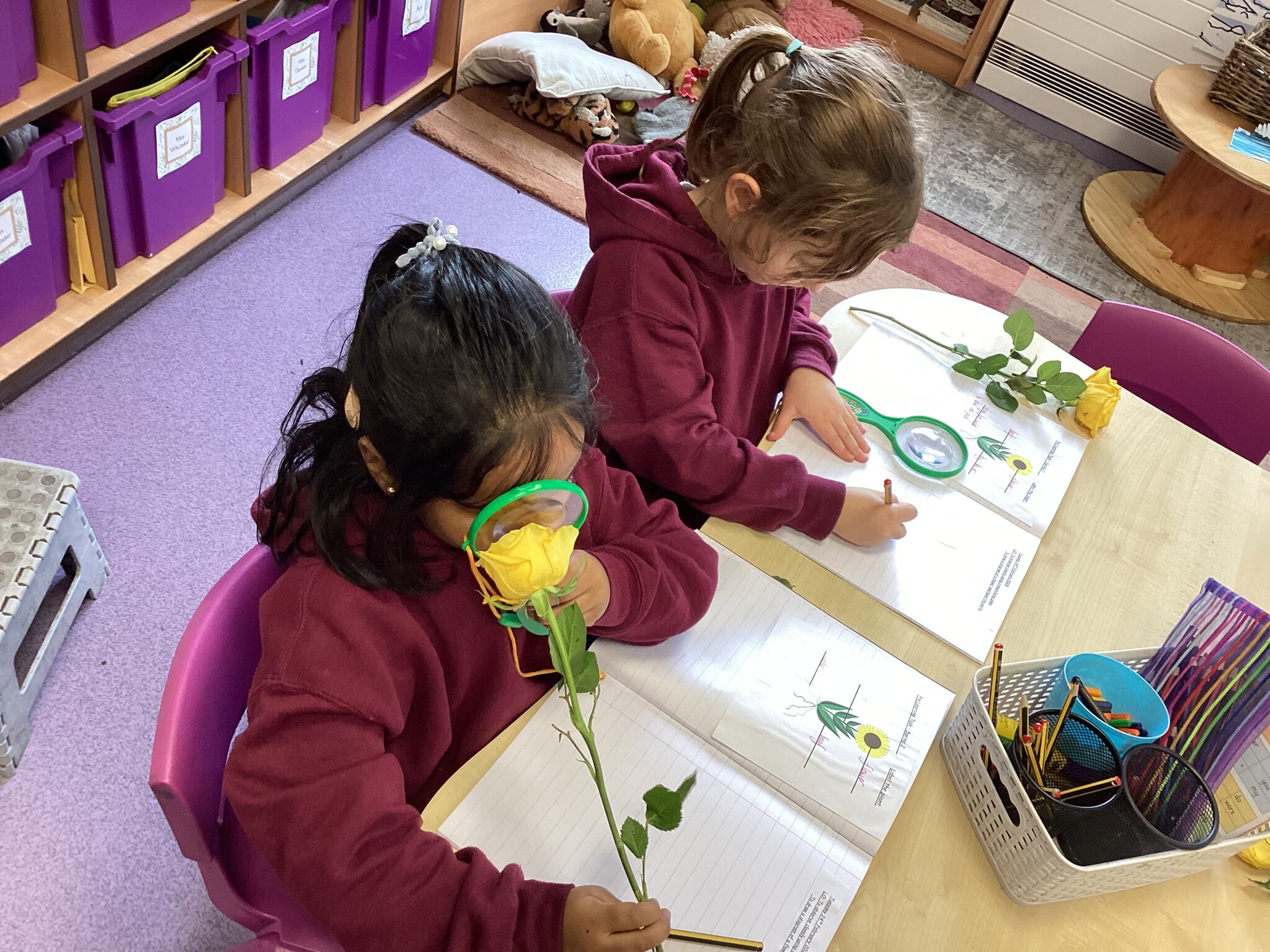 This week in Science, Year 1 have been using magnifying glasses to look at parts of flowers. They then drew a diagram of their flower and labelled the petals, stem, and leaves.