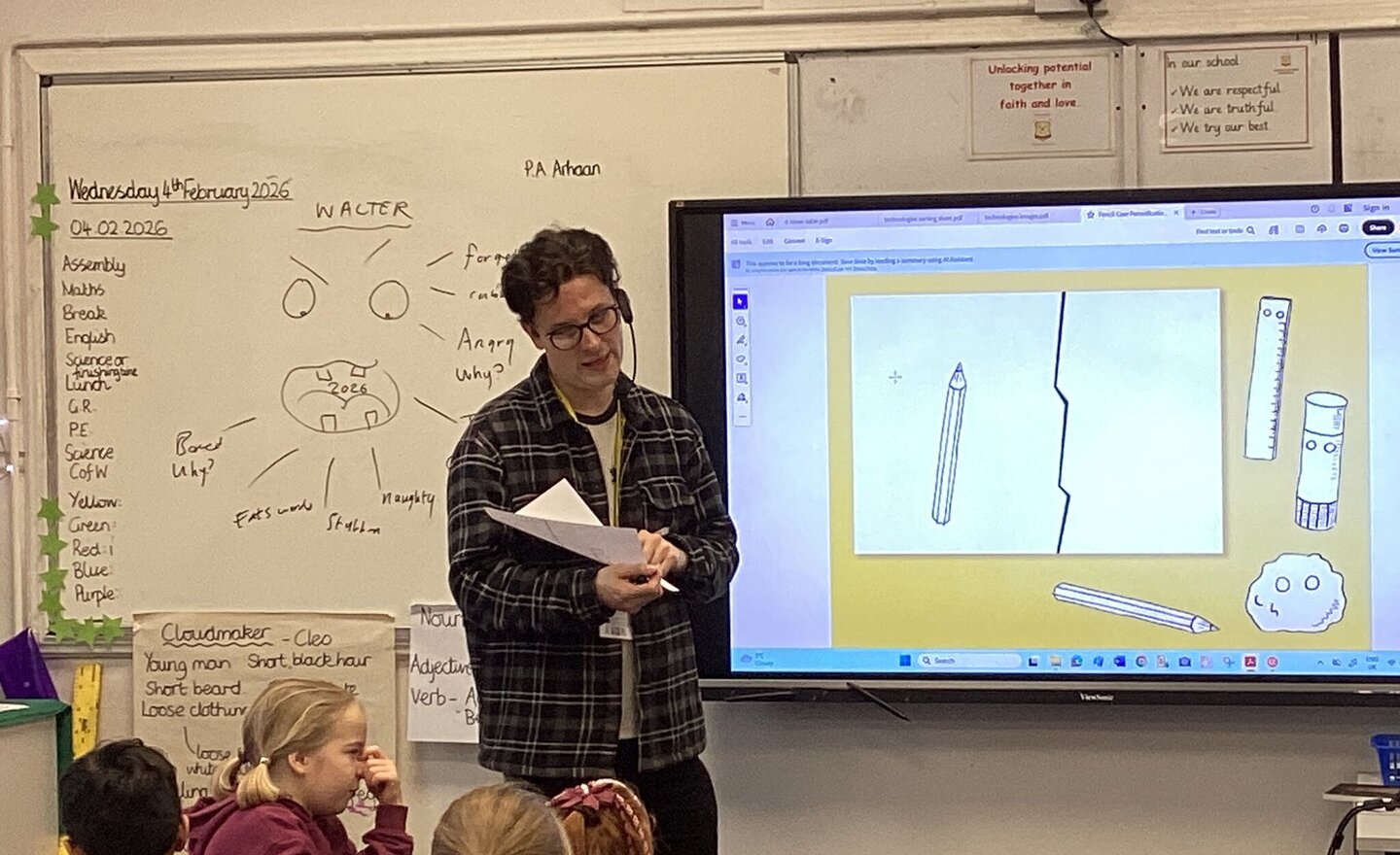 Year 4 enjoyed their visit from the author, Sean Perkins, today. He helped us to see classroom objects as characters with their own personalities and the children developed their own ideas from this to create characters for pencils, rulers, glue sticks and even the whiteboard!