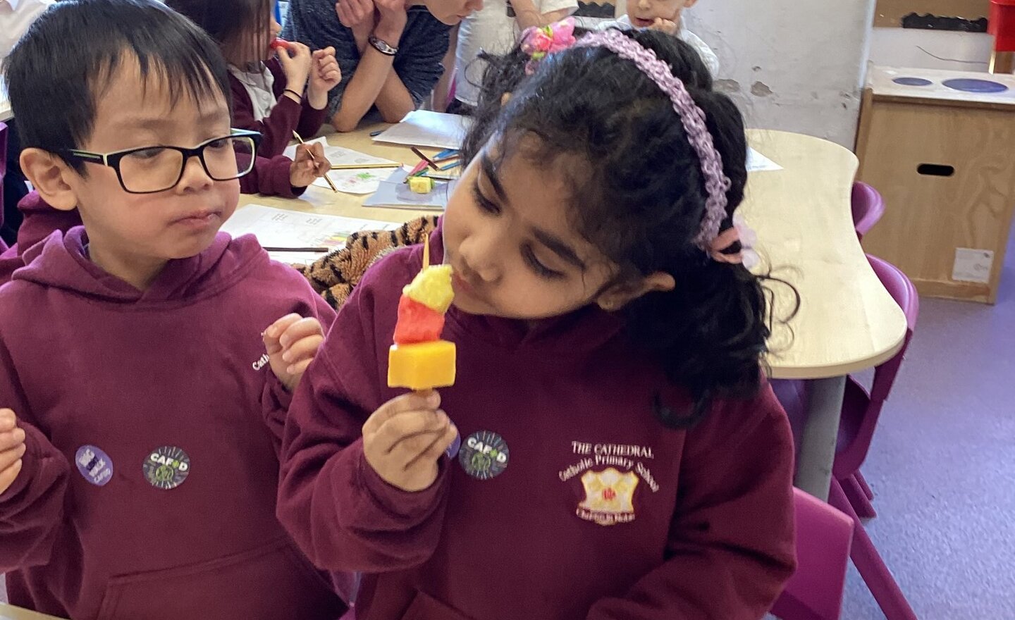 In DT, Year 1 have been reviewing fruit kebabs. This is product research ahead of them designing and making their own fruit kebabs.