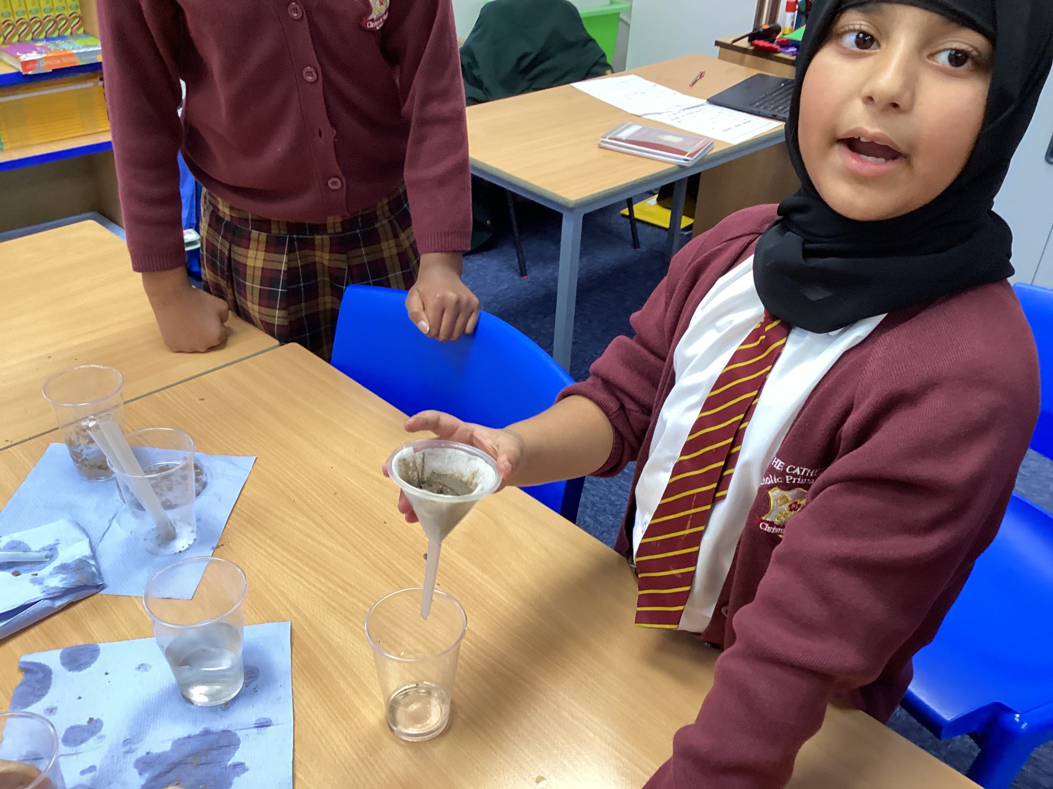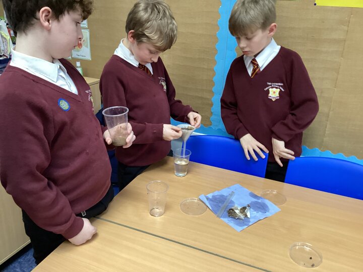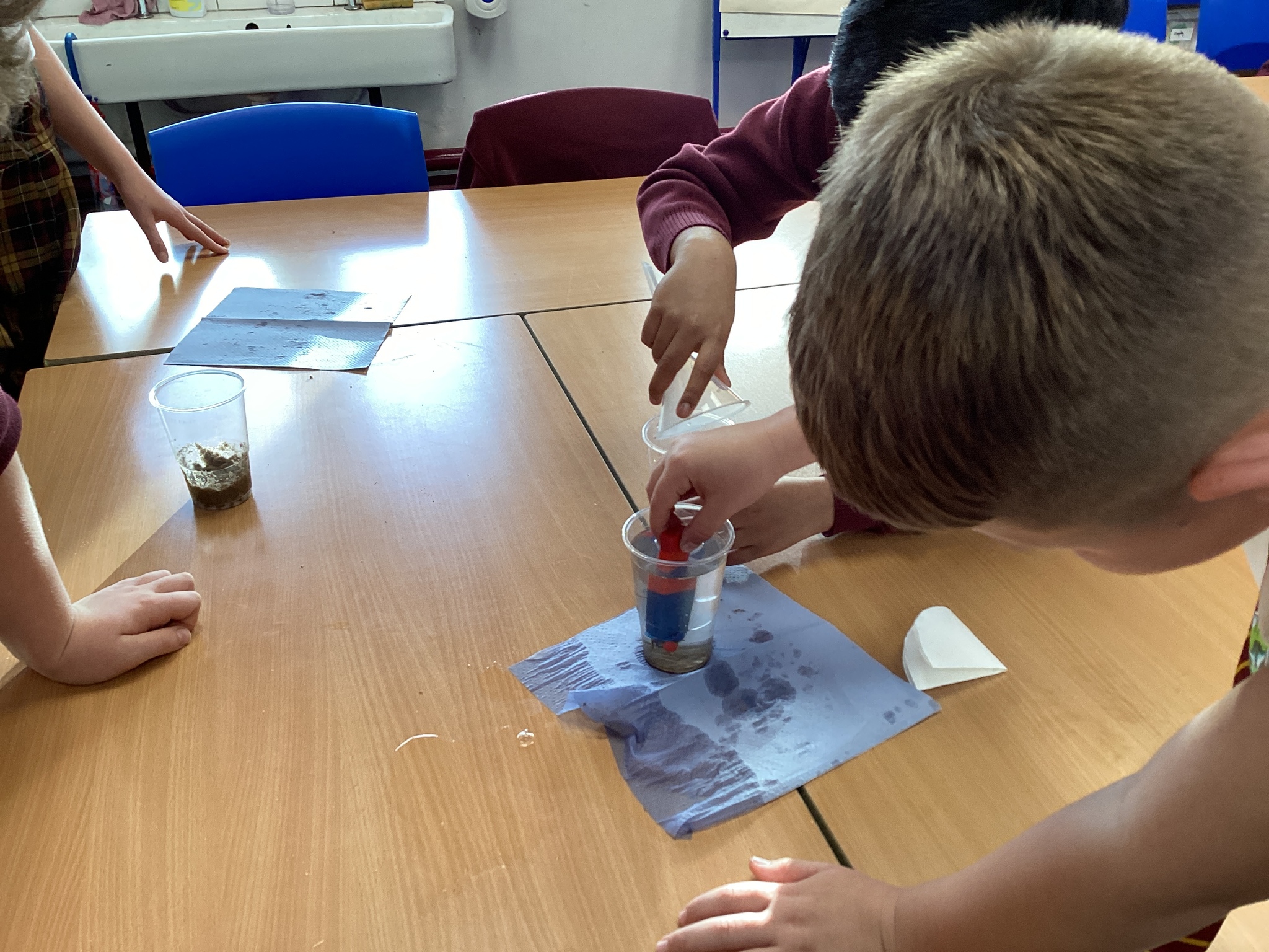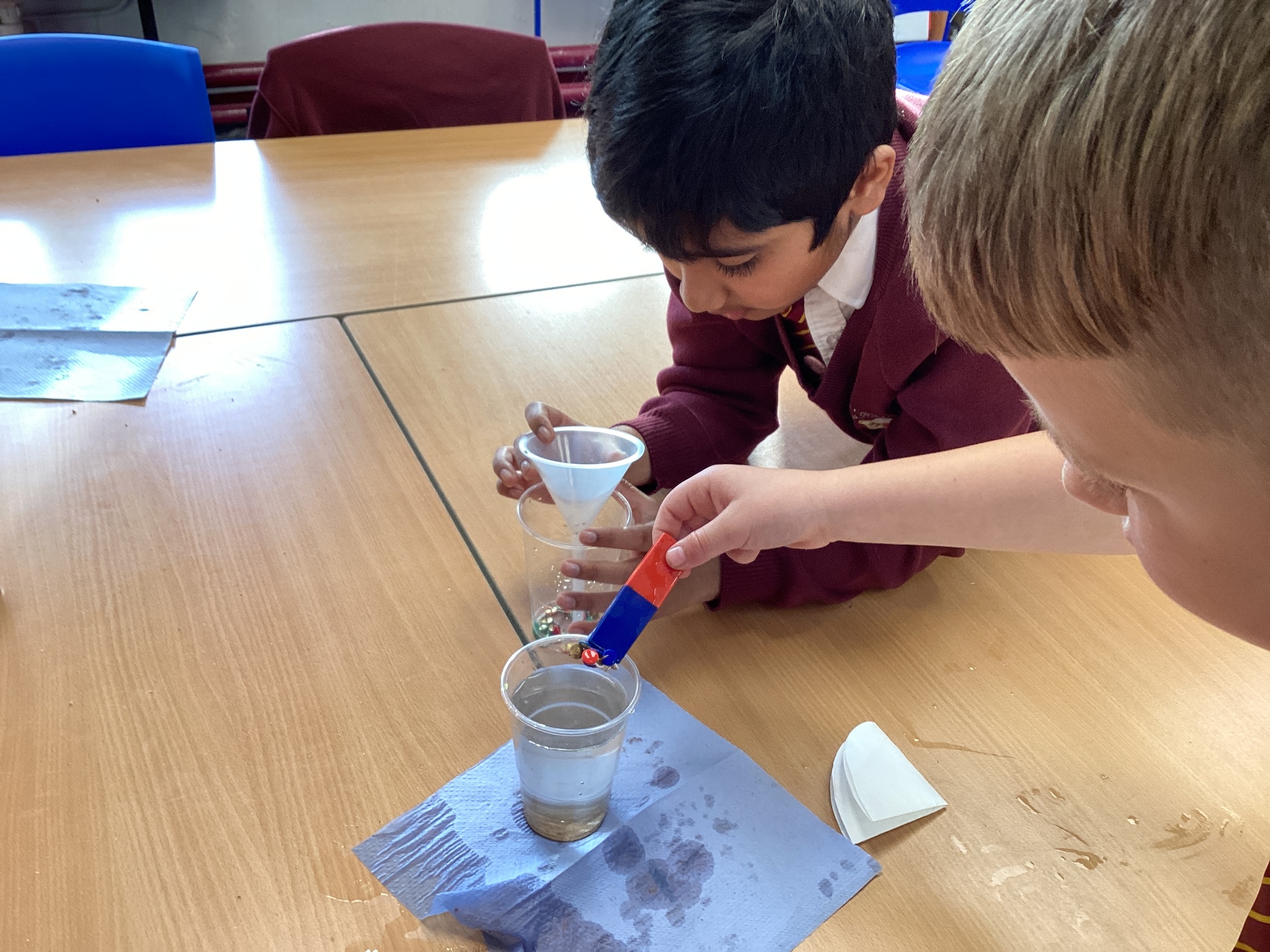 Year 5 have been learning about properties of materials. We had to separate a mixture of sand, salt and drawing pins without putting our fingers in the mixture. We really had to think hard about how to do it and used a variety of methods. We used a magnet to remove the drawing pins, then added water to dissolve the salt and filtered the remaining mixture. We discovered that dissolving salt is a reversible change.